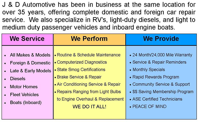 J & D Automotive has been providing quality car care in Redding, CA, since 1979. We are a family-owned business delivering honest and professional automotive repair and auto maintenance services to the people of Redding and surrounding areas. The quality ASE (Automotive Service Excellence) certified technicians at J & D Automotive employ today’s latest automotive technology and are equipped to handle all major and minor repairs on foreign and domestic vehicles.